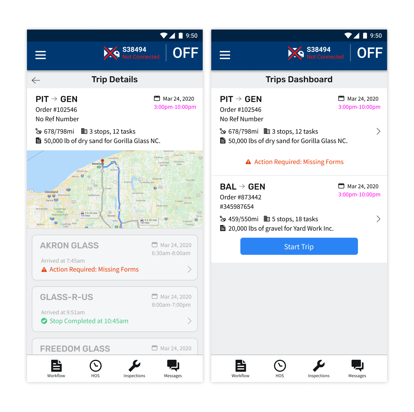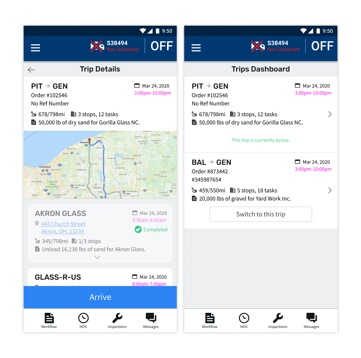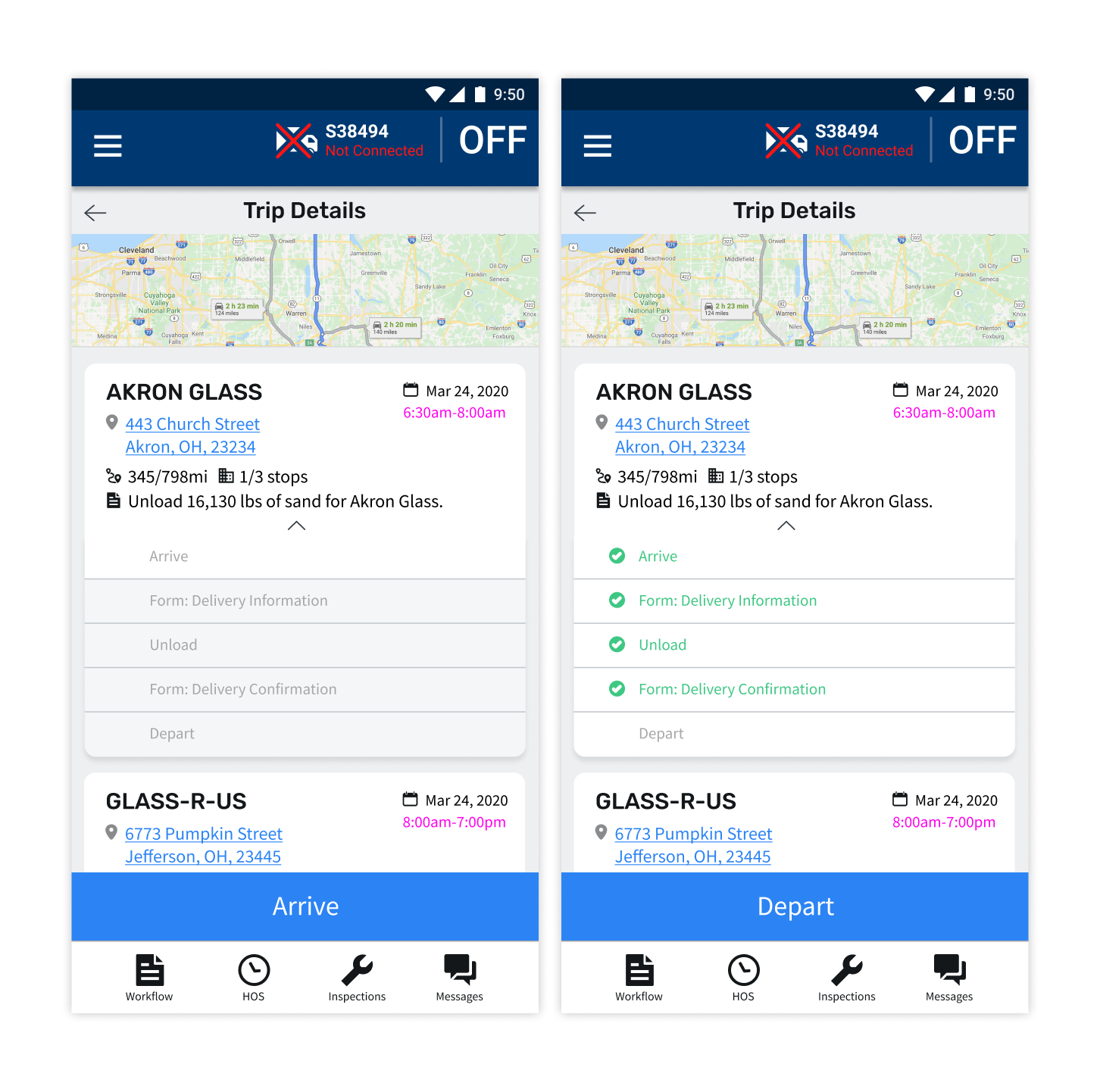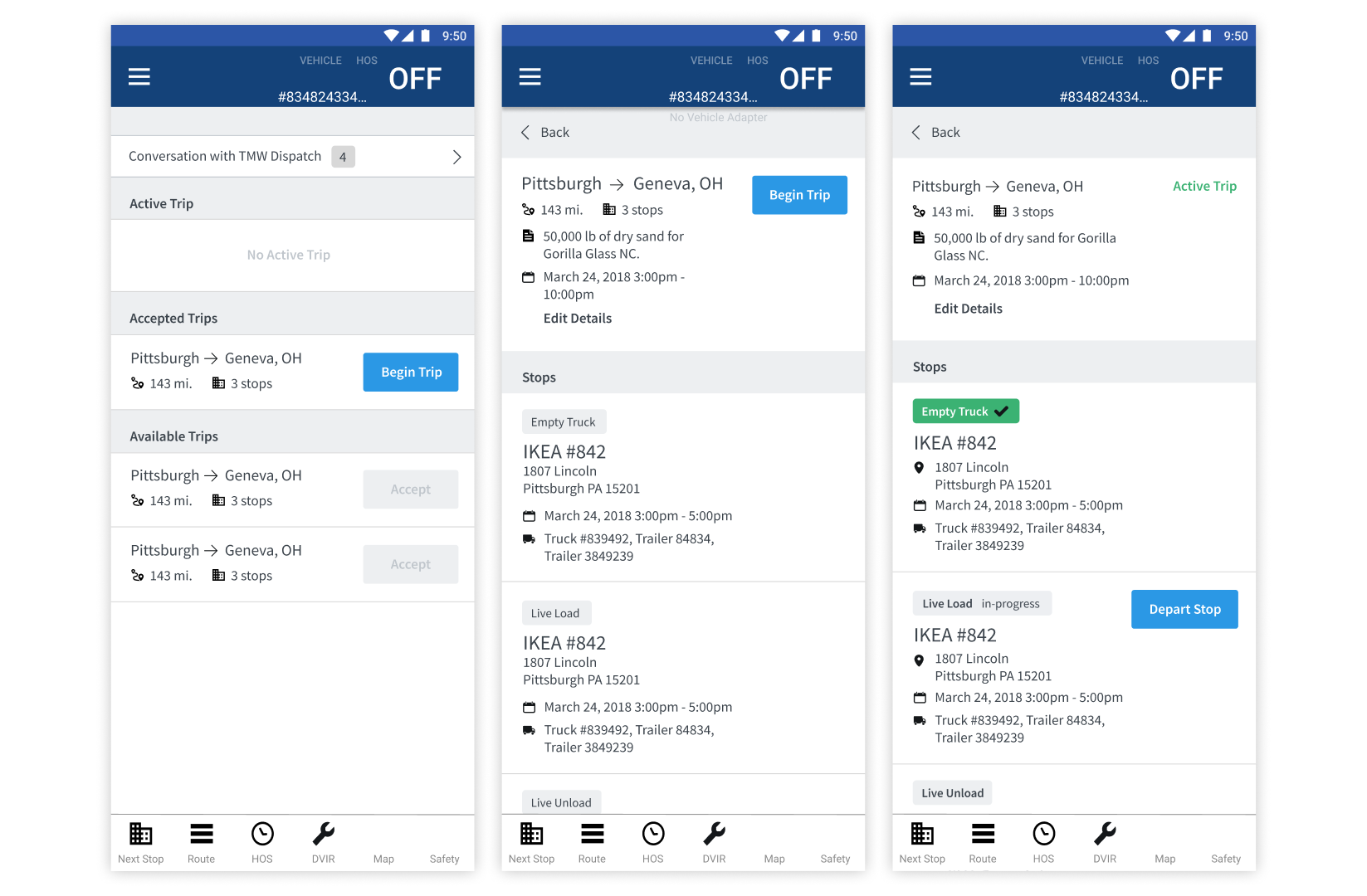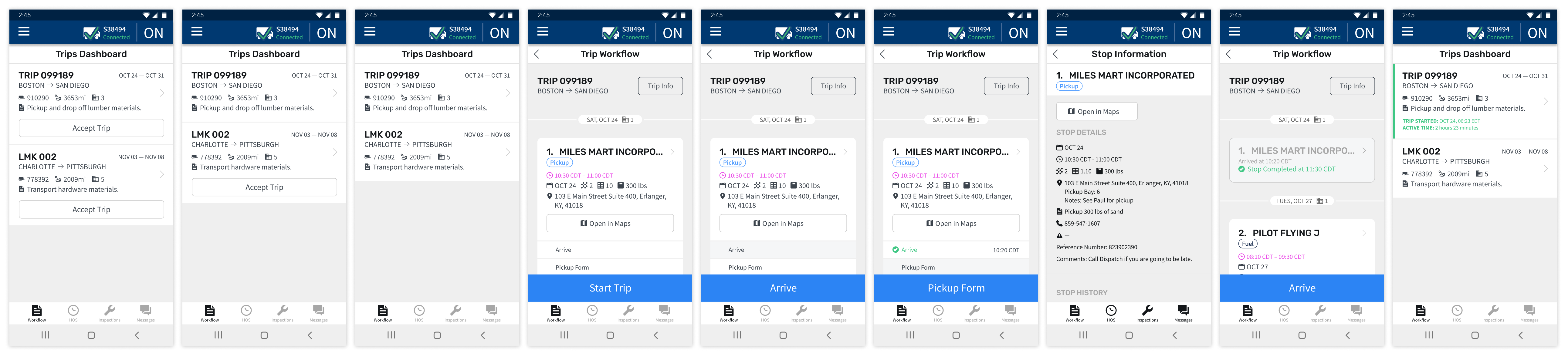 There are a few existing workflow solutions used currently, and Maven even had their own legacy workflow "hack" that I learned a lot from. The images below show KeepTruckin (left), Omnitracs (center), and Maven's legacy workflow product (right). I interviewed drivers who used these solutions along with our own Customer Service representatives and found that the two biggest issues people had were that theses interfaces were not intuitive and they didn't show drivers enough information. We needed to find a way to be transparent about all the information drivers might need are their trip without flooding the interface and keeping it simple and easy to use.